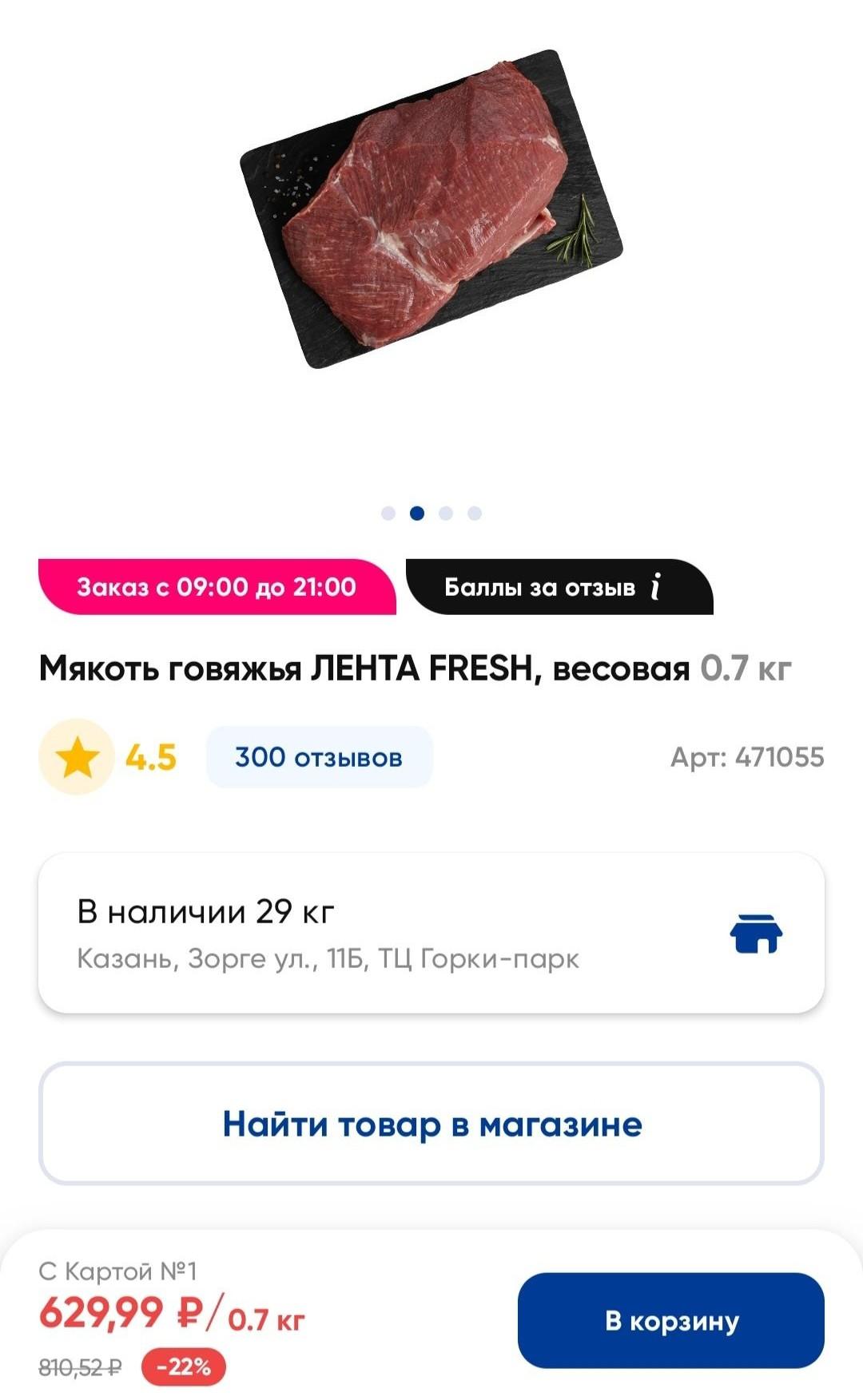 В гипермаркете «Лента» цена за килограмм мякоти по карте составляет 900 рублей.