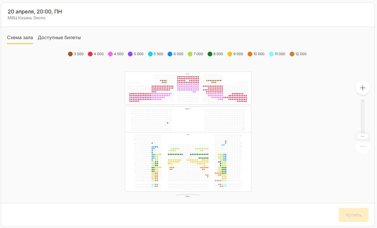 Билеты в первые ряды практически отсутствуют, их цена достигает 11–12 тысяч рублей. Более бюджетные места доступны от 3,5 тысячи рублей.
