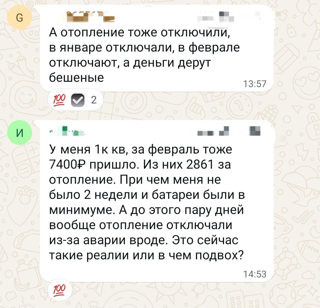 Другой участник чата сообщил: «За февраль тоже 7400 пришло. Из них 2861 за отопление. Причем меня не было 2 недели и батареи были на минимуме. Это сейчас такие реалии или в чем подвох?»