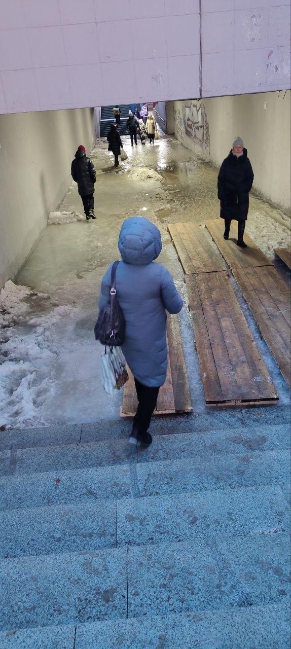 На перекрёстке улиц Ямашева и Мусина в подземном переходе скопилась снежная каша, создавая опасность для пешеходов. Для обеспечения безопасности были установлены специальные поддоны, однако даже они не смогли полностью предотвратить подскальзывание.