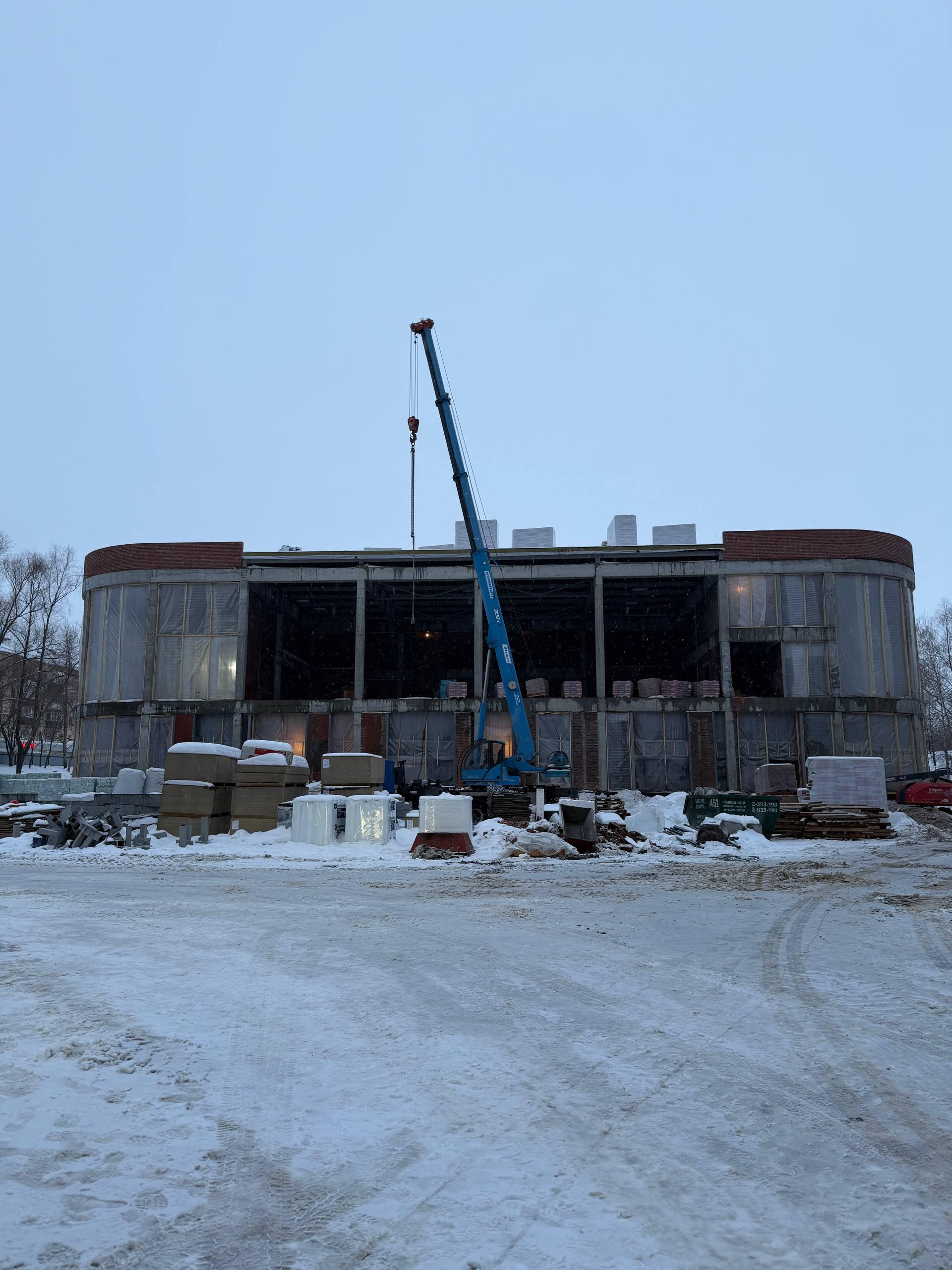 На изображениях видно, что здание еще не завершено: стены остаются серыми, на полу разложены материалы, а окна не установлены.