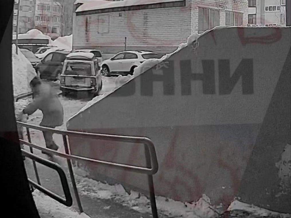 Инцидент произошел накануне, и на записи видно, как женщина успела оттащить малыша в безопасное место перед падением снега.