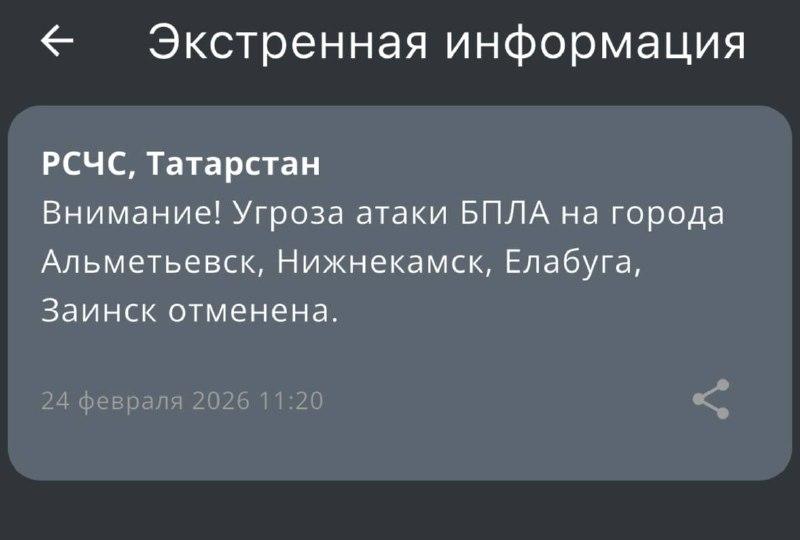 Угроза атаки беспилотных летательных аппаратов была отменена в Альметьевске, Нижнекамске, Елабуге и Заинске. МЧС направило соответствующее уведомление жителям в 11:20 24 февраля.