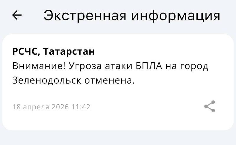 МЧС России отменило угрозу атаки беспилотных летательных аппаратов на Зеленодольск. Соответствующее уведомление поступило в 11:43, спустя 30 минут после первоначального предупреждения.