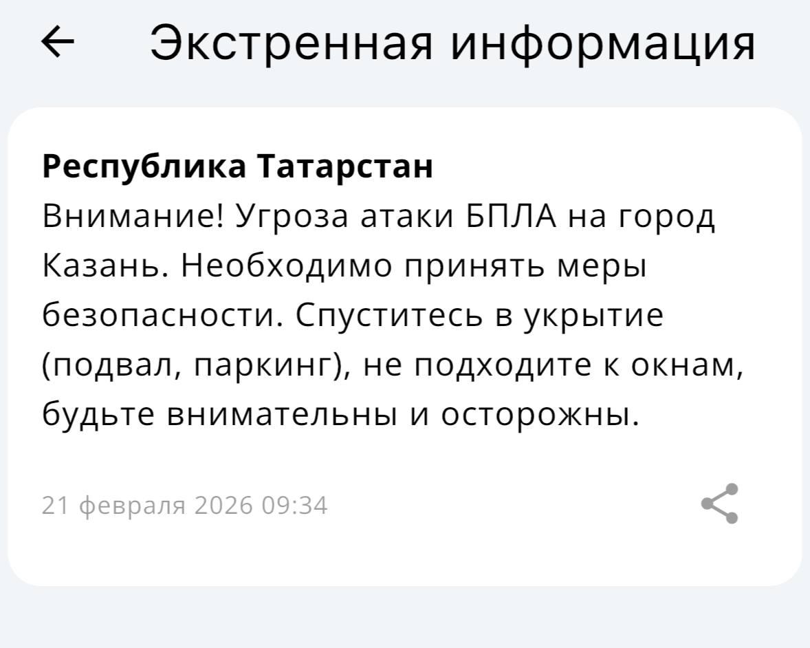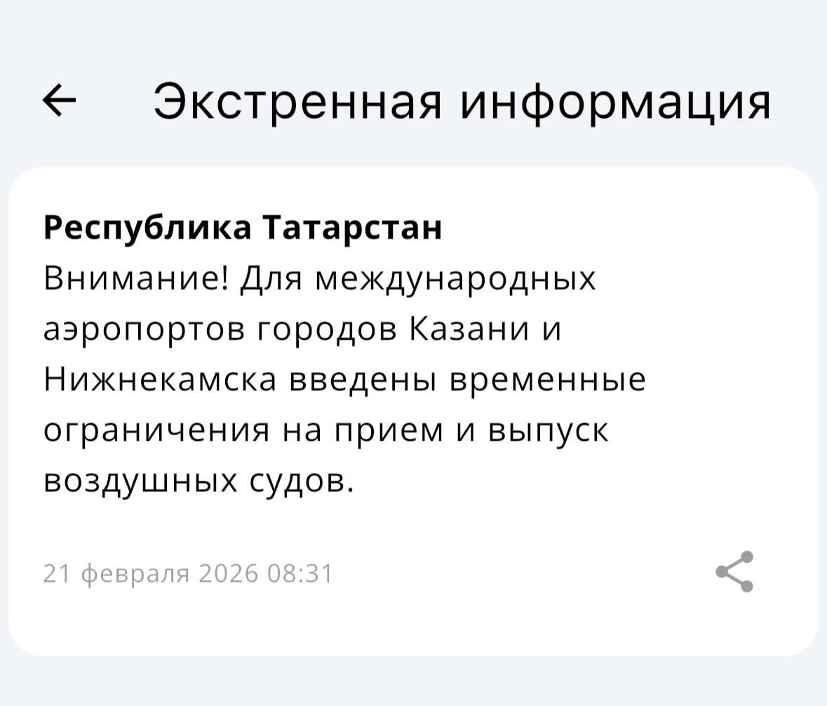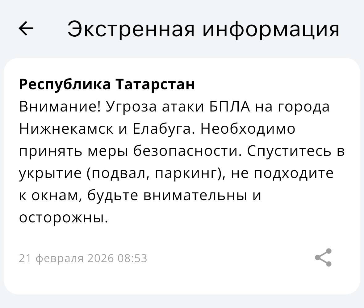 Утром МЧС распространило оповещения о введении режима угрозы атаки беспилотников в Казани, Нижнекамске и Елабуге. Уведомления были разосланы в 08:53 и 09:34.