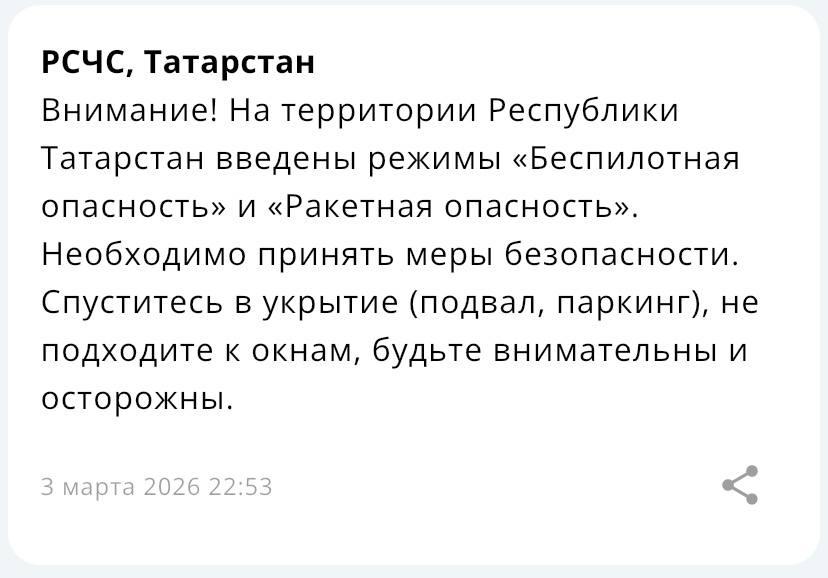 В Татарстане в вечернее время были введены режимы ракетной и беспилотной опасности. Сообщение об этом от МЧС поступило в 22:53.