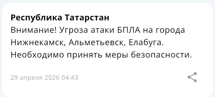 В Нижнекамске, Альметьевске и Елабуге с 4:42 утра введен режим угрозы атаки беспилотных летательных аппаратов. Об этом сообщает МЧС.