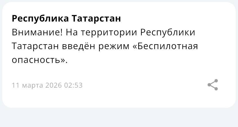 Сообщение о введении режима беспилотной опасности в Татарстане было отправлено МЧС в 2:53.